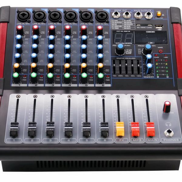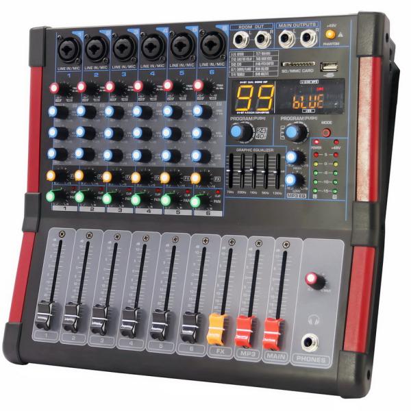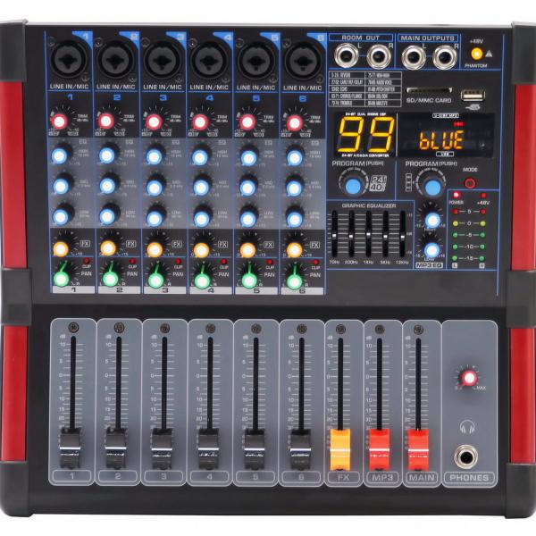 Each of the 6 channels features XLR/TRS combo inputs, 3-band EQ (Low/Mid/High), gain control, pan adjustment, and mute — ideal for microphones, instruments, or line-level sources.