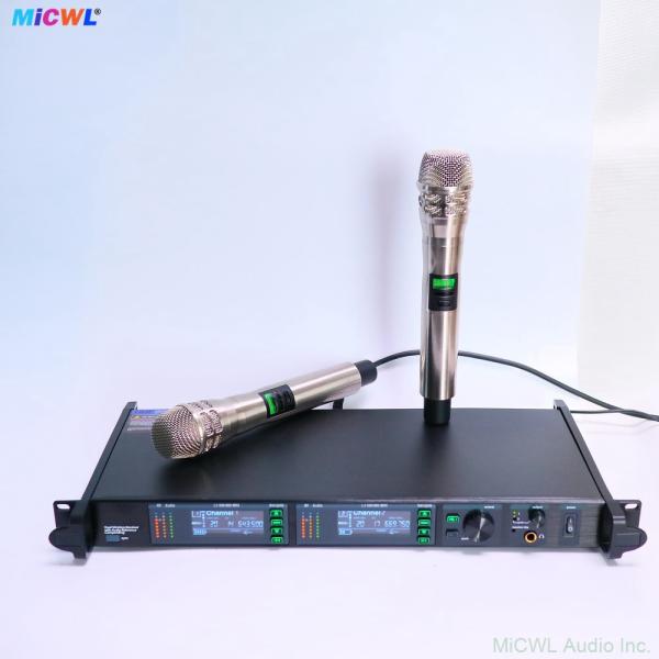 LED Display on Handhelds: Each mic features an LCD screen showing power status, channel, and signal level for easy monitoring.