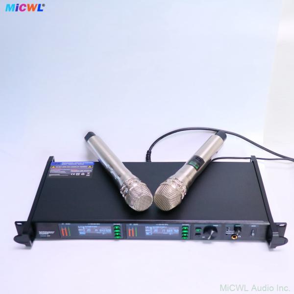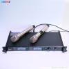 1U Rack-Mount Receiver: Compact, durable metal chassis with dual LCD displays showing real-time signal strength, frequency, and battery status.