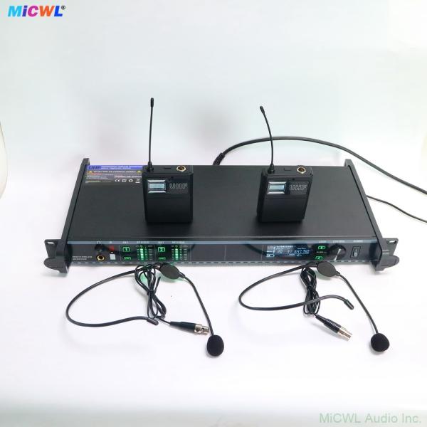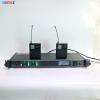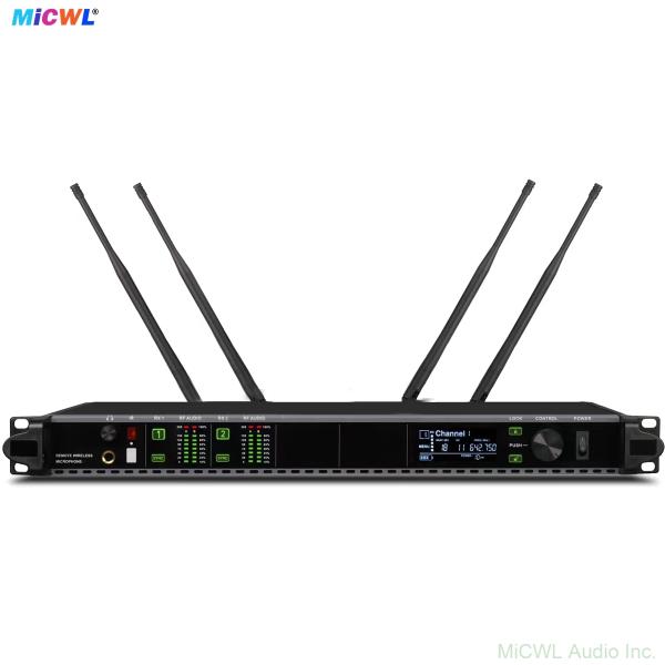 - Rack-Mountable Receiver: 1U metal chassis design fits seamlessly into standard audio racks. LED display shows real-time status including channel, RF level, battery life, and frequency settings.