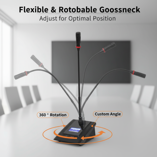 Adjustable 360° gooseneck arm positions mic precisely. Built-in LED indicators show channel status, battery level & signal strength at a glance.