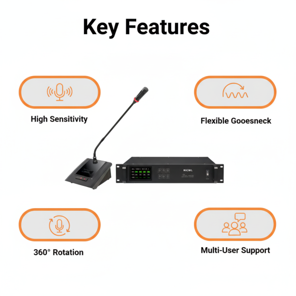 Support 1–300 units—perfect for boardrooms, auditoriums, or multi-room conference centers. Add mics anytime without rewiring.